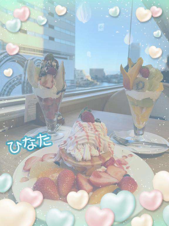 お写真は両親とフルーツたくさんのパフェ