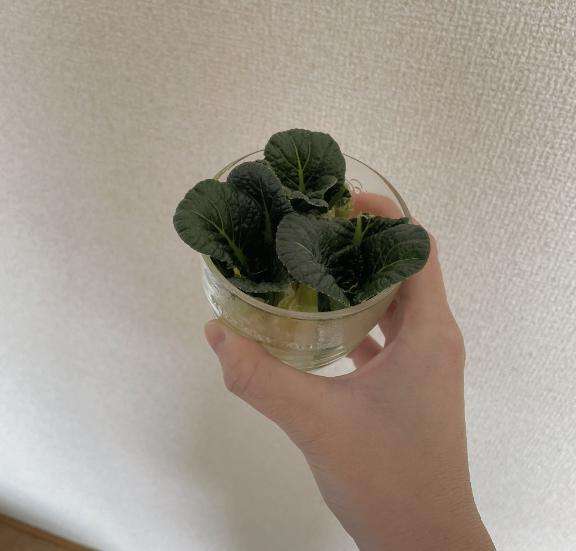 小松菜を根から5cmほど切って、水につけて育てている写真です?
